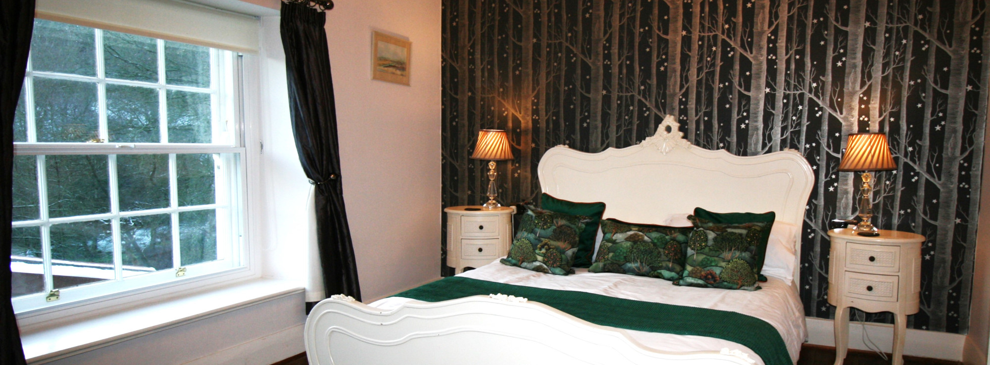 Jervaulx overlooks the lake and has a wooden floor. It is bright and airy with white painted French style furniture, including a king size bed. Its light and airy bathroom is private to the room and is located 1m across a quiet corridor, with a shower over the bath.